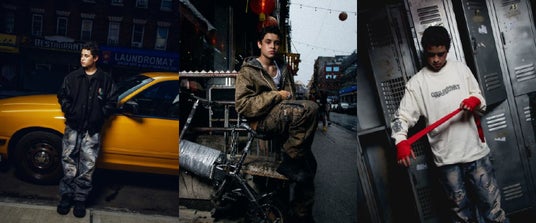 次に、橋を渡ってマンハッタンに入ると、Fall 2024 Collectionにふさわしい活気あふれる景色が広がります。Juniorはチャイナタウンの賑わいをかき分け、歩道に腰を下ろしながら、モダンで新しい”着古した”ウォッシュ加工が施されたカーゴの2ピースを着用しています。