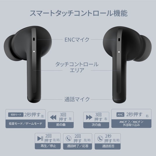 充実したタッチコントロール機能アプリを必要としない本製品は、ほとんどの動作をイヤホン本体のタッチコントロールで操作します。