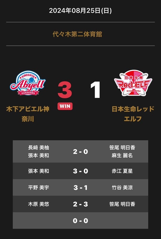 木下アビエル神奈川と日本生命レッドエルフの試合は3-1で木下アビエル神奈川が勝利しました。