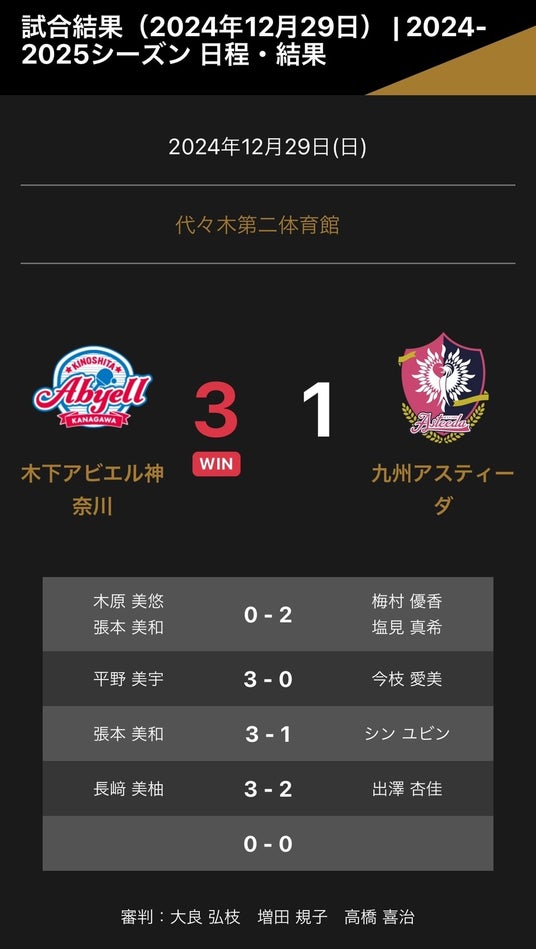 ノジマTリーグ 2024-2025シーズン 公式戦 12月29日開催 木下アビエル神奈川vs九州アスティーダ試合結果