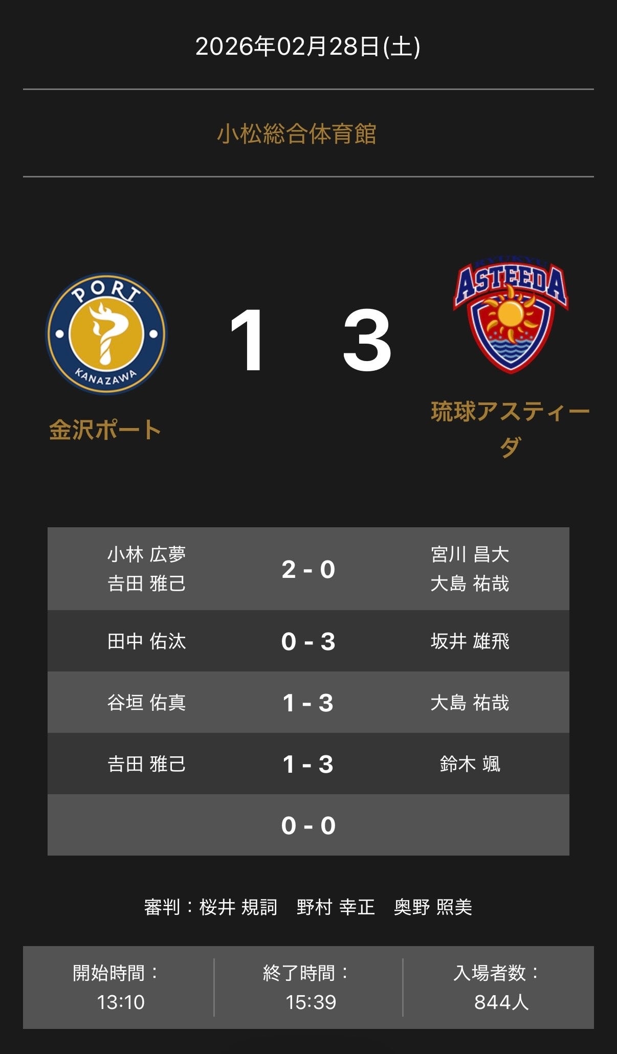 ノジマTリーグ 2025-2026シーズン 公式戦 2月28日(土)開催 金沢ポート vs 琉球アスティーダ の試合は3-1で琉球アスティーダが勝利しました。