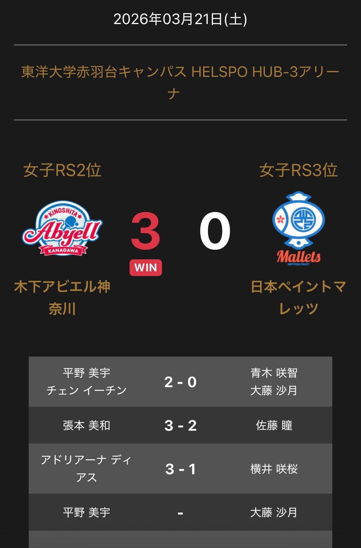 ノジマTリーグ 2025-2026シーズン 公式戦 3月21日開催 女子セミファイナル 木下アビエル神奈川 vs 日本ペイントマレッツ の試合は、3-0で木下アビエル神奈川が勝利しました。