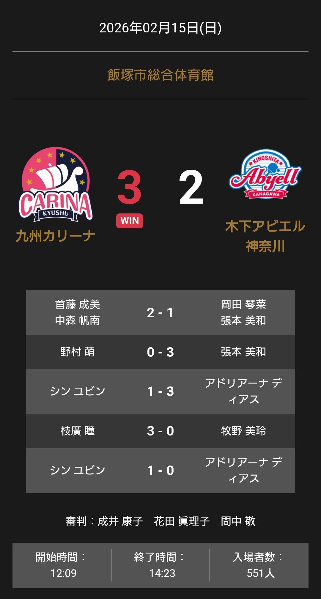ノジマTリーグ 2025-2026 公式戦 2月15日開催 九州カリーナ vs 木下アビエル神奈川 試合結果