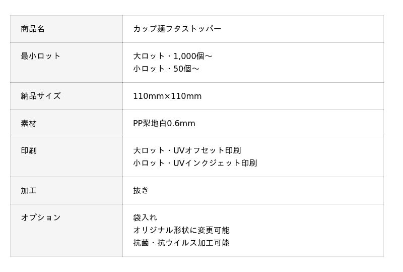 『カップ麺フタストッパー』は、カップ麺のフタを押さえる丈夫なPP製の便利グッズです。全面フルカラー印刷ができるため、コラボパッケージのデザインをそのまま活かしたグッズが作製できます。