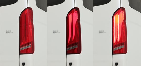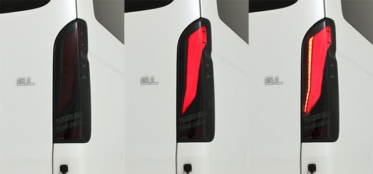 点灯時はレッドのベースからレッドバーのLEDが2本出現。こちらもLEDの輝度が高いので、視認性もよく、他のハイエースと差別化できるリアビューを実現できます。