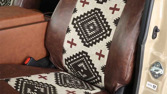「KNOT RECORDS」シリーズでお馴染みの、自然な風合いで温もりのあるブラウンレザーの切り替えに、存在感のあるオルテガ柄ファブリックを採用。オルテガ柄はブラウンレザーと調和がとれるようにオリジナルデザインで仕上げました。背もたれと座面の中央はファブリック、汚れやすく痛みやすい両サイドとヘッドレストはレザーというレイアウトなので、ファッション性を損なわずに実用的なのもポイントです。