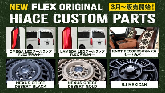 ハイエース専門店を全国展開するFLEX(フレックス)が、新作のハイエース専用オリジナルカスタムパーツ(テールランプ、ホイール、シートカバー)を2025年3月に発売