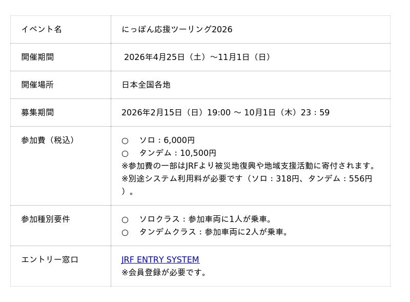 一般社団法人日本ライダーズフォーラム(以下、JRF / 本社:東京・渋谷区、代表/風間深志)が2026年4月25日(土)より開催する社会貢献型ツーリングイベント「にっぽん応援ツーリング2026」の参加エントリーを、2026年2月15日(日)19:00より開始いたしました。