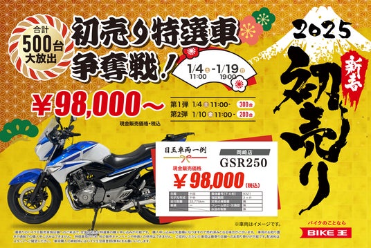 バイクを買うなら「バイク王の初売り2025」で!「初売り特選車争奪戦!合計500台大放出!98,000円~」1月4日からスタート!
