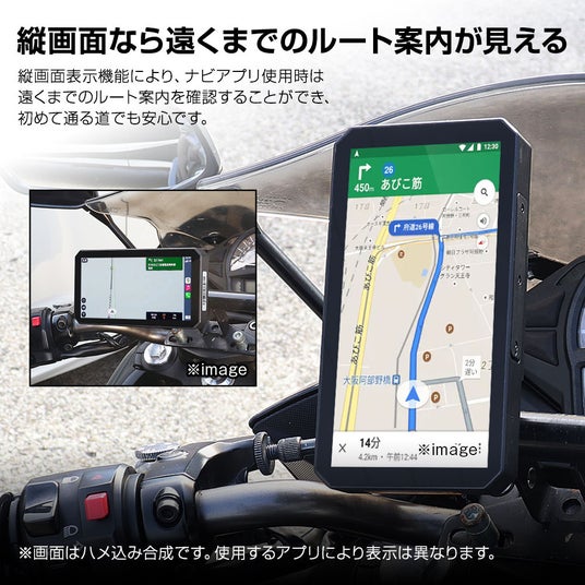スマートフォンのナビアプリを使用する場合、横置きより更に遠くのルートを確認できモニターを最大限に活用でます。設置スペースが少ないバイクでもスマートに設置ができます。