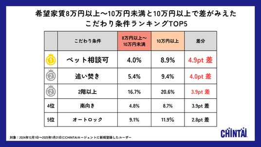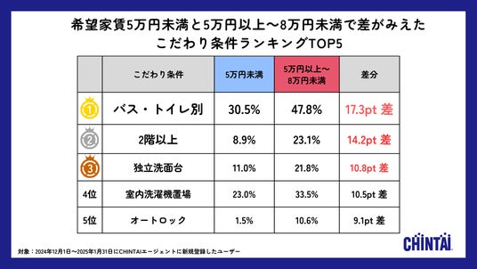 ■こだわり条件に見る“家賃の壁” 家賃とともに変化する理想の住まい像 『CHINTAIエージェント』登録者が設定したこだわり条件を、希望家賃帯ごとに比較したところ、家賃帯によって重視される条件に違いがあることがわかりました。 「最低限の快適さ」が求められ始める、“5万円の壁” 5万円未満と、5万円以上~8万円未満の希望家賃帯を比較したところ、「バス・トイレ別」や「2階以上」など、最低限の快適さに関わる条件の設定率が大きく増加していました。このことから、「暮らしやすさ」を意識した住まい選びが本格化する最初の分岐点は、5万円台にあることがわかります。