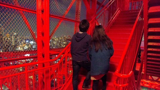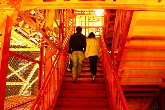 夜のオープンエア外階段コースの醍醐味はなんといっても、夜景を眺めつつ、ライトアップに浮かび上がる「鉄骨」の中を昇っていく感覚を味わえること。展望台までの道のりをお散歩気分で、会話と夜景を楽しみながら、時に励ましあいながら昇っていけば、自然と2人の仲は深まり、愛の「ステップアップ」に結びつくかもしれません。