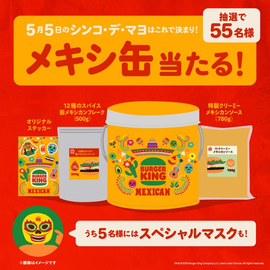 バーガーキング(R) 京都競馬場店(京都府京都市伏見区葭島渡場島町32 京都競馬場 1F フードコート)         5月5日の「シンコ・デ・マヨ」を「メキシ缶」で祝おう!     オリジナルステッカー・新メキシカンフレーク・特製クリーミーメキシカンソースが         詰まった「メキシ缶」が55名様に当たるキャンペーン開催!             ラッキーな5名様にはオリジナルマスク入り!         公式アプリの応募用クーポンでお得に購入して応募しよう!  「クリーミーメキシカン・アボカドワッパー(R) 」の発売を記念して「メキシ缶」が抽選で55名様に当たるキャンペーンを4月11日(金)8時~4月17日(木)23時59分の1週間限定にて開催いたします。
