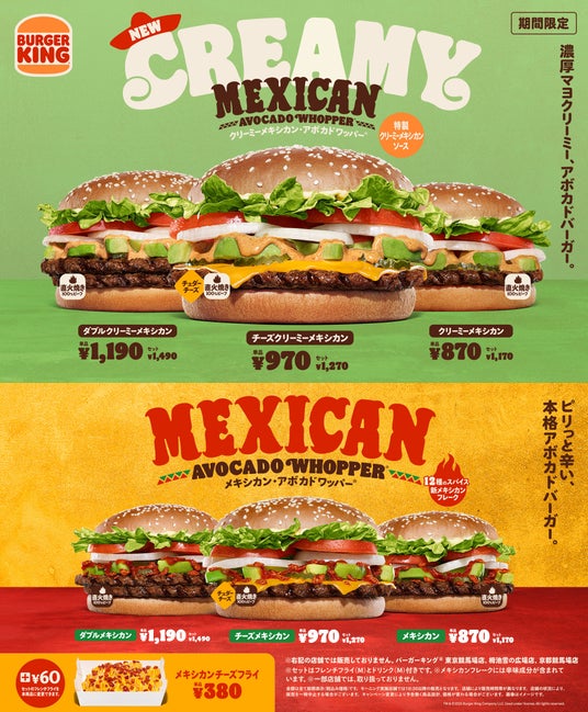 価 格:380円  『チーズメキシカン アボカドワッパー(R) 』『メキシカン アボカドワッパー(R) 』『ダブルメキシカン アボカドワッパー(R) 』も好評発売中です。