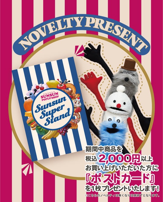 開催期間中、パペットスンスン関連商品を合計2,000円(税込)以上購入の方に、特典としてポストカードを1枚プレゼントいたします。