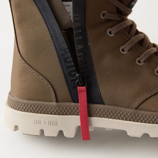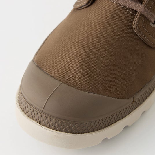 1947年、フランスの外国人部隊が砂漠地帯を行軍するために開発したPAMPA(パンパ)。ブランドヘリテージとして70年以上にわたり引き継いだミリタリーテイストあふれる凹凸アウトソールがパラディウムの大きな特徴。そのアウトソールに、フェスシーンやアウトドアでも活躍する防水アッパーを合わせたのが、PAMPA HI SEEKER(パンパハイ シーカー)。