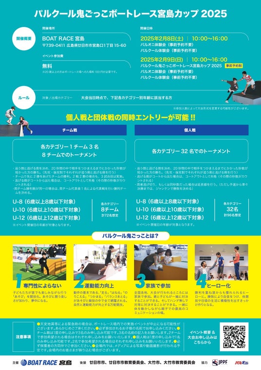 BOAT RACE宮島で開催される「パルクール鬼ごっこボートレース宮島カップ2025 」では、「あそびがカラダを作る!」をテーマに、パルクール鬼ごっこで楽しさとともに能力を向上させる、小学生以下及びその保護者を対象とした限定のイベントを2月8日(土)・9日(日)で2日間に渡り開催!