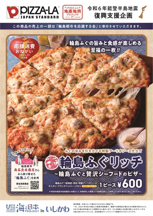 株式会社フォーシーズ(本社:東京都港区南青山 代表取締役会長兼CEO:淺野幸子)が展開する宅配ピザ「PIZZA-LA」は、同社「地産地消プロジェクト」の取り組みとして一般社団法人「海と日本PROJECT in いしかわ」と協力し、石川県輪島市の特産品「輪島ふぐ」を使用した地産地消ピザ『輪島ふぐリッチ』を全国のピザーラキャラバン、イベントで販売することを決定いたしました。