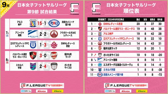 9月7日(土)・8日(日)の2日間で実施された女子Fリーグ2024-2025 第9節の5試合について結果をお知らせいたします。
