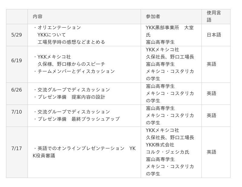 リアルな課題と実践的な経験 YKKメキシコ社の久保社長自らが提示する「社員と企業のエンゲージメントをいかに高めるか」という最重要課題に取り組みます。特に「働き方(時間、場所)」「キャリアアップ(給料、ステップアップ)」「福利厚生(休み、家族サービス)」といった、従業員の働く上でのモチベーションに直結するテーマを題材に、YKKメキシコ社が実際に行ってきた過去の取り組みでの改善例や新たな課題について学んだあと、課題が出されます。社会課題を海外目線から探究し、これからの社会を生き抜くための多文化共生スキルと英語コミュニケーション力を身に着けます。 プログラムの殆どが英語で行われ、プレゼンテーションの準備から発表まですべて学生が主体となり実施されます。 国際共同学習 富山高専の学生だけでなく、メキシコおよびコスタリカの学生(日本語学習者)もチームに加わり、異文化理解を深めながら共同で課題解決に取り組みます。メキシコ人のワークスタイルや価値観(例:ジョブホッピングの傾向、キャリアアップへの意識、家族の重要性など)といった参考情報を踏まえつつ、現地の学生の生の声を取り入れることで、より現実的で多様な視点からの解決策が期待できます。 企業との緊密な連携 課題提供だけでなく、YKKメキシコ社の久保社長や野口工場長、YKK黒部事業所の人事担当者がプログラムに関与し、学生の提案に対して、フィードバックや評価を行います。優秀な提案は企業での採用の可能性もあり、授業の枠を超えた実践的な取り組みとなっています。関係者からのコメント