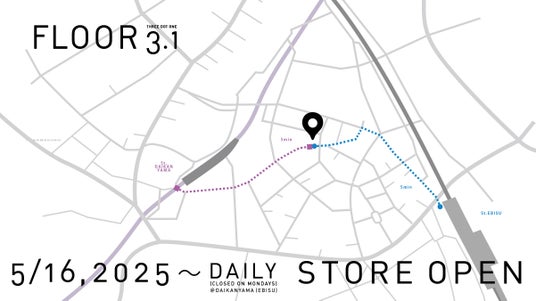 5月16日(金)より代官山にてオープンします。FLOOR 3.1 STOREでは新作の発表、受注をはじめ、即売品やFLOOR 3.1オリジナル商品もご用意します。ブランドやアイテムを通して斬新 な提案に出会う機会です。どなたでもご来場、ご購入できます。実際に手にとって確かめ、作り手のデザイナーと直接対話できる機会もございます。皆様のご来場をお待ちしています。