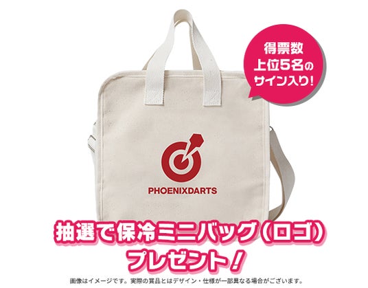 X(旧Twitter)「#フェニックスダーツ推し活」をつけて、推しの応援投稿してくださった方の中から、抽選で5名様に、得票数上位5名のサイン入り保冷ミニバッグ(ロゴ)をプレゼントいたします。