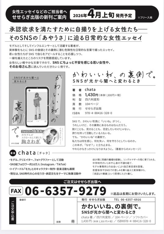 SNS総フォロワー約16万人を持つクリエイター chata は、今春、株式会社せせらぎ出版より書籍『かわいいね、の裏側で』を刊行。