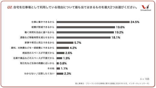 自宅を仕事場にしている理由は『仕事に集中できるから』『経費節減できるから』『働く時間を自由に選べるから』が上位