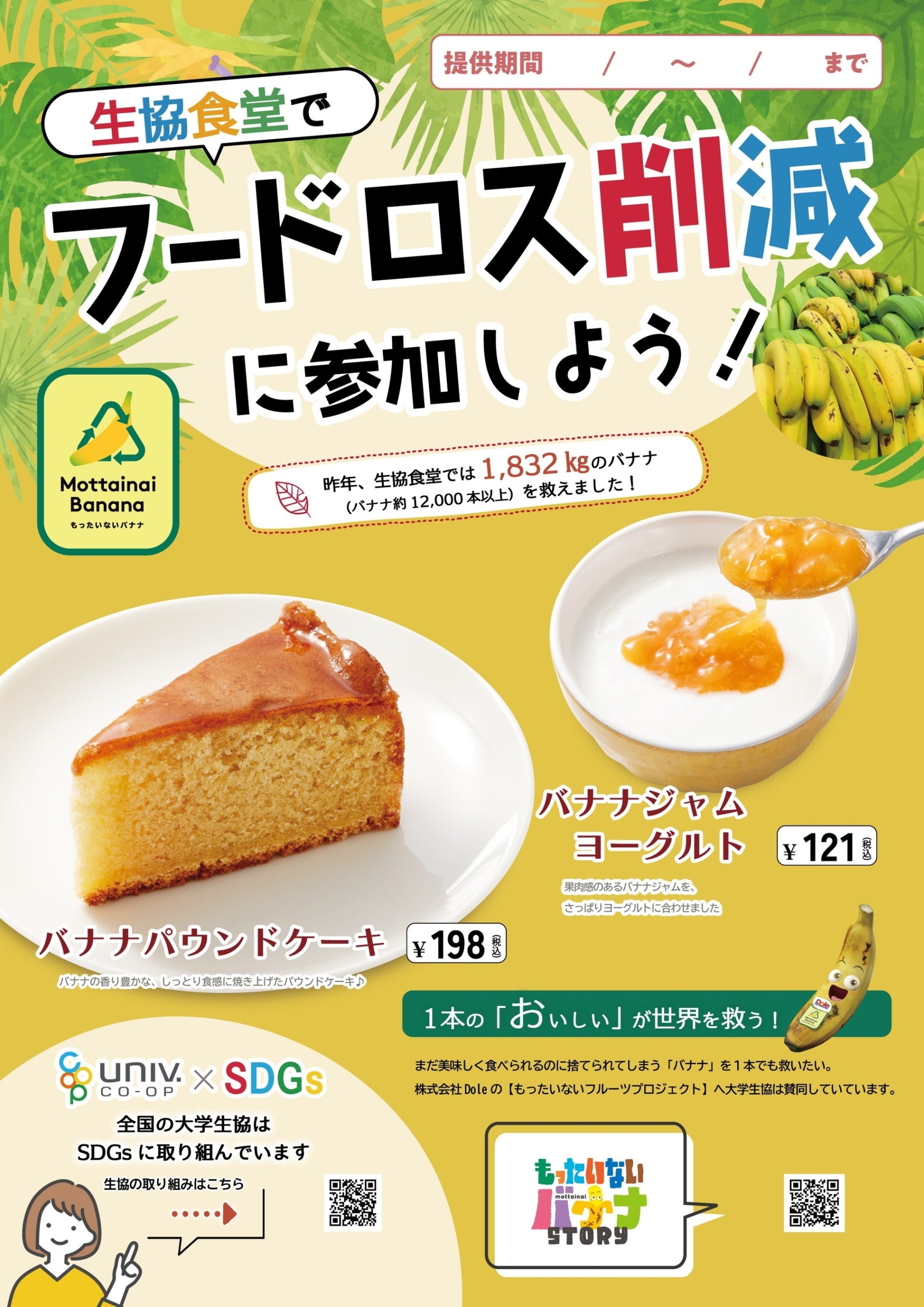 第二弾となる今回は「生協食堂でフードロス削減に参加しよう!」をテーマに、果肉感のあるバナナジャムを、さっぱりヨーグルトに合わせた「バナナジャムヨーグルト」と、昨年に引き続き「バナナパウンドケーキ」の2品が、北海道大学や東北大学、東京大学、名古屋大学など、東日本エリアの、のべ85大学164店舗で提供されます。販売期間は、2026年1月12日(月)から1月24日(土)までを予定しています。 ■背景 Doleはフルーツで人々の様々な暮らしを笑顔にしていきたいという思いを込め、「フルーツでスマイルを。」というブランドメッセージのもと、バナナの廃棄削減を目指す「もったいないバナナ」プロジェクトに取り組んでいます。