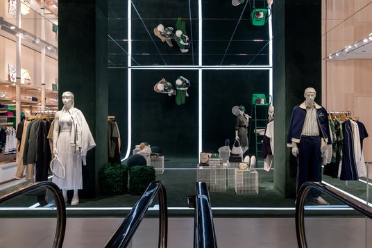外観は、鮮やかなグリーンのミラーファサード。ニューヨークのエネルギーを映し出しつつ、アメリカの精神とラコステのスタイルを融合させた、象徴的な建築となっています。