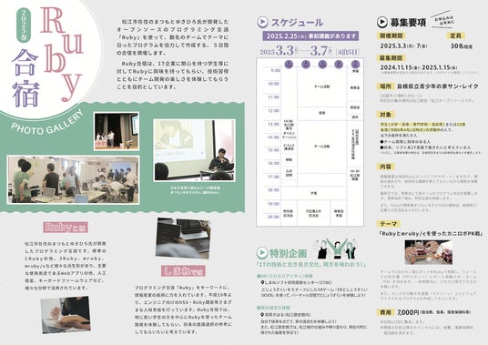 島根県は、学生・25歳以下の求職者を対象に、プログラミング言語「Ruby」を使ってチームでのプログラミングを体験する4泊5日の合宿「Ruby合宿2025春」の参加者を募集します。