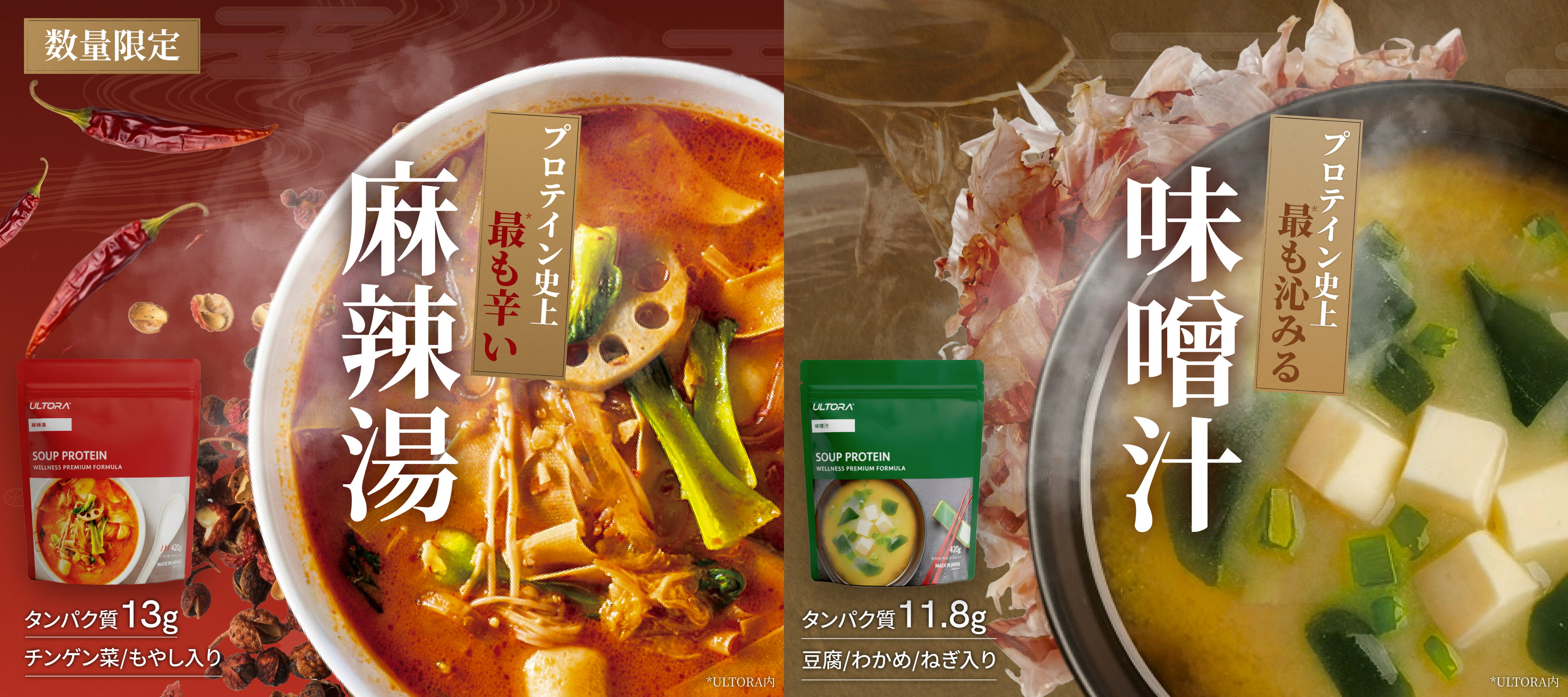 株式会社ULTORA(所在地:東京都渋谷区、代表取締役:山崎 玲)は、食事として楽しめる「スーププロテイン」シリーズより、新フレーバー「麻辣湯」「味噌汁」 の2種を数量限定で発売いたしました。