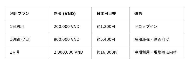 料金:2,500,000 VND (約 15,000円) / 1ヶ月利用