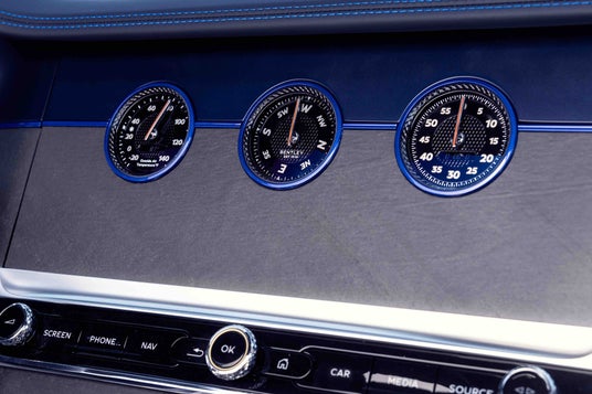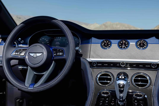 澄み渡るコーチェラ バレーの星空にインスパイアされて誕生した、ピーコックブルー サテン仕上げのコンチネンタルGTスピードとコンチネンタル GT コンバーチブル。外装はサテンカーボンファイバー、エレクトロブルー、ピーコックブルーを組み合わせたトライトーンデザインが繊細なコントラストを生み出しています。内装では、ピーコックブルー サテンとスレートストーンベニヤが織りなすツートンフェイシアに、エレクトロブルーのピンストライプがアクセントを添えます。同じブルーはエアベントやヘッドレストの縁取りにも施され、統一感と品格を演出。さらに、セレニティキルトがシートやトノカバーに美しく施され、洗練されたディテールが全体を引き立てています。