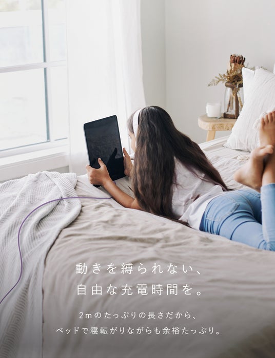 画像はスパイラルシリコンケーブル1mです。 絡みにくいシリコンケーブルの良さが際立つ、長さ2mモデルが登場 1mモデルは、卓上使いやお出かけ時に最適な長さでしたが、「ベッドやソファーでリラックスしながら使うにはちょっと短いかも」「床に置いた電源タップの充電器から、リビングテーブル上のタブレットに充電したい」というお声を数多くいただき、2mモデルを追加しました。 本製品は、単純に長さを2mに伸ばしたわけではなく、磁力としなやかさのバランスを再考、程よい力でまとまりつつも使用時には丸まらない、最適なバランスを追及しています。
