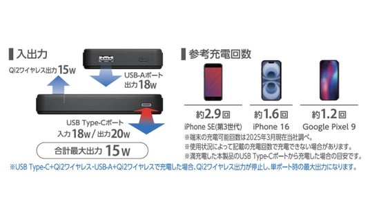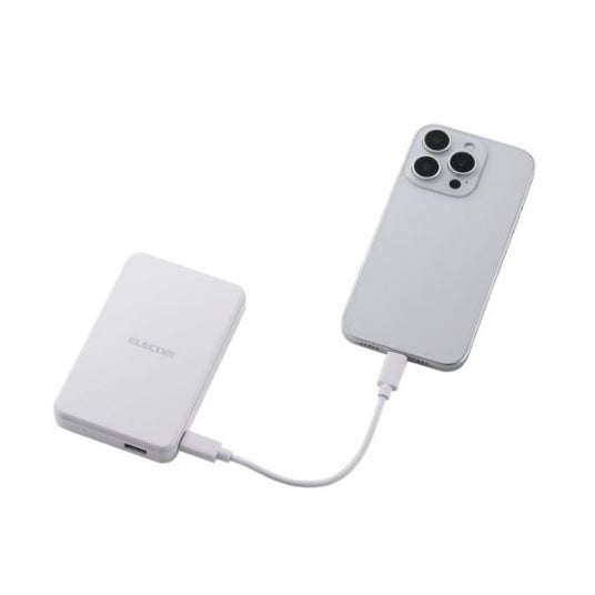 エレコム株式会社(本社:大阪市中央区、取締役社長執行役員:石見 浩一)は、マグネットで取り付け、最大15Wでワイヤレス充電が可能なQi2対応モバイルバッテリーを新発売いたしました。 スマートフォンの背面にしっかりと吸着し、ケーブルなしで充電が可能です。WPC(ワイヤレスパワーコンソーシアム)が策定したワイヤレス給電の国際標準規格「Qi(チー)2」の正規認証品です。 バッテリー容量は10,000mAhで、3,000mAhのスマートフォンを約1.9回充電可能です。また、Thermal Protection機能も搭載しており、24時間体制で温度を監視・制御することで、接続中の機器を過熱などからしっかり守ります。カラーは、ブラック・ホワイトの2色からお選びいただけます。 マグネットでiPhoneにしっかり固定!ワイヤレス充電できるモバイルバッテリー - Qi2対応iPhoneにマグネットで取り付け、最大15Wでワイヤレス充電できるモバイルバッテリーです。 - WPC(ワイヤレスパワーコンソーシアム)が策定したワイヤレス給電の国際標準規格「Qi(チー)2」の正規認証品です。 - エレコムはWPCの会員企業です。 - 強力なマグネットでスマートフォンをしっかり固定。コイル位置がぴったり合うため効率よく充電できます。 ※iPhone 12以降のMagSafe対応iPhoneおよび、Qi2規格のマグネット固定に対応した機器のみに対応しています。※ケースを外した状態、またはワイヤレス充電とマグネット固定に対応したケースを装着した状態でご利用ください。 - 本製品は、電磁誘導技術を活用したワイヤレス充電の規格である「Qi(チー)2」認証製品で、同規格の機器と互換性があります。 ※機器によってはうまく動作しない場合があります。本製品および、ご使用になる機器の取扱説明書をよくお読みください。 - 最大出力20WのUSB Type-C(TM)(USB-C(TM))ポート×1、最大出力18WのUSB-Aポート×1を搭載。Qi2ワイヤレス充電の他に、ケーブルを使った充電も可能です。 ※USB Type-CとUSB-Aの同時接続の場合、合計最大出力は15Wとなります。※USB Type-C and USB-C are trademarks of USB Implementers Forum. 3,000mAhのスマートフォンを約1.9回充電可能 - USB Type-C+Qi2ワイヤレス、またはUSB-A + Qi2ワイヤレスで充電した場合、Qi2ワイヤレス出力が停止し、単ポート時の最大出力(USB Type-C:20W、USB-A:18W)になります。 - USB Type-CポートまたはUSB-Aポートによる有線充電とワイヤレス充電を同時に使用した場合、有線充電が優先され、ワイヤレス充電は停止します。 - Bluetooth(R)イヤホンなどが充電可能な低電流モードに対応しています。 ※USB-Aポートのみ対応しています。 - 接続機器を見分けて、最適に充電を行う"おまかせ充電"に対応しています。 ※USB-Aポートのみ対応しています。 - 本製品(バッテリー容量10,000mAh)で、3,000mAhのスマートフォンを約1.9回充電可能です。 ※満充電した本製品のUSB Type-Cポートから充電した場合の目安です。※満充電した本製品で電源オフの状態のスマートフォンを充電する際の目安回数です。充電中に電源を入れたり、機器を使用したりしている場合は記載の数値まで充電できない場合があります。※ワイヤレス出力を使用した場合の充電回数は記載の数値より低くなります。 - Nintendo Switch(TM)、Nintendo Switch Lite(TM)などのゲーム機も充電可能です。 ※Nintendo Switchドックでの充電はできません。 - 本製品は約4時間で充電できます。 ※USB Power Delivery 20W以上のAC充電器にUSB Type-C - USB Type-Cケーブルを接続し充電した場合の目安です。スマートフォンなどのモバイル機器を接続した場合は記載の時間では充電できません。 - Thermal Protectionを搭載し、24時間温度を監視、制御することでお使いの機器を守ります。 ※Nintendo Switch(TM)、Nintendo Switch Lite(TM)は任天堂株式会社の登録商標です。 本製品とスマートフォンを同時に充電できる"まとめて充電"に対応 - 本製品とスマートフォンを同時に接続することで、まとめて充電できる"まとめて充電"に対応しています。 ※スマートフォンへ優先的に充電されます。スマートフォンの充電が完了すると本製品に充電されます。※接続機器によっては本製品への充電が優先され、機器への充電に時間がかかる場合があります。 安心・安全設計 - 過充電・過放電・過電流防止機能および短絡保護機能と異物検知機能の5つの保護機能を備えた安心の回路設計です。 - 電池容量が160Wh(43,243mAh)以下であるため、機内持ち込みも可能です。 ※航空会社の規定によって例外がある場合があります。 - 内蔵の充電式リチウムイオン電池は、JIS C8711およびJIS C8712(JIS C8714の内容を含む)の安全設計です。 - 日本の電気用品安全法(PSE)の技術基準をクリアした安全性の高い製品です。 ご購入前に、ご一読ください - 持ち運びに便利な小型USB Type-C - USB Type-Cケーブルを付属しています。 ※ケーブルを挿したままにするとバッテリーの残量が減ってしまいます。使用しない場合は必ずケーブルを外してください。※AC充電器は同梱しておりません。別途ご購入またはご用意ください。※AC充電器はUSB Type-Cの出力ポートを