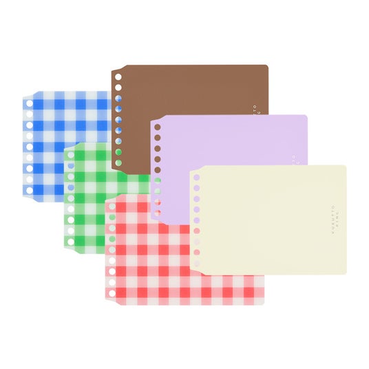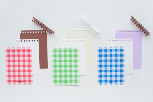 表紙のラインアップは、シンプルな無地で人気色のアイボリー・パープル・ブラウンと、ファッションや雑貨で昨今のトレンドであるギンガムチェック柄のレッド・ブルー・グリーンの合計6柄。リングはクリアとブラウンの2色です。なお、あらかじめ組み合わせされたセット品での販売もございます。