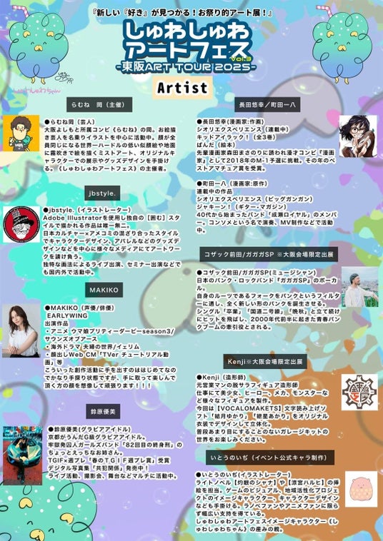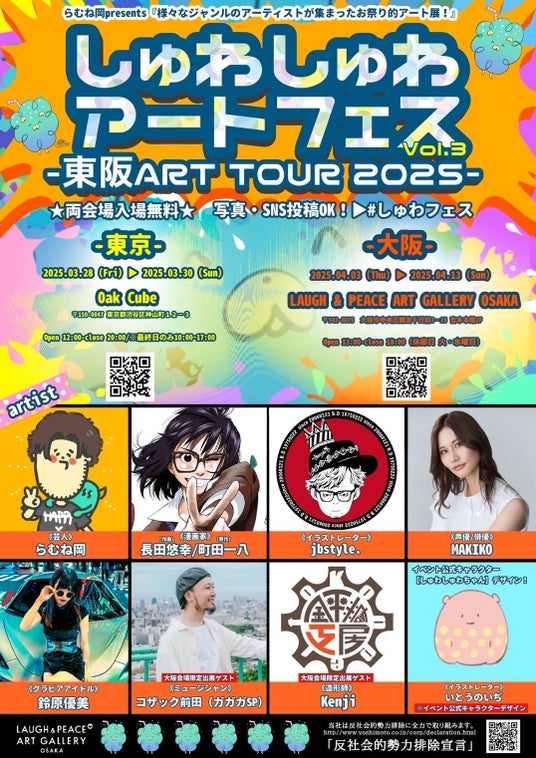 この度、 2025年3月28日(金)~3月30日(日)に東京・渋谷のOak Cube、4月3日(木)~4月13日(日)に大阪・なんばのLAUGH & PEACE ART GALLERY OSAKAにて、 らむね岡presentsの多ジャンルアートフェス「しゅわしゅわアートフェス Vol.3 ー東阪ART TOUR 2025ー」を開催することが決定しました。