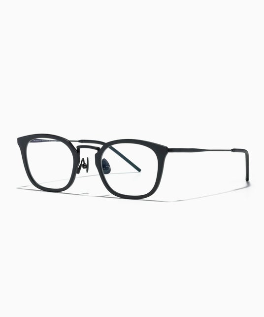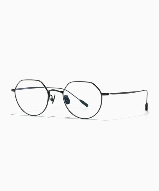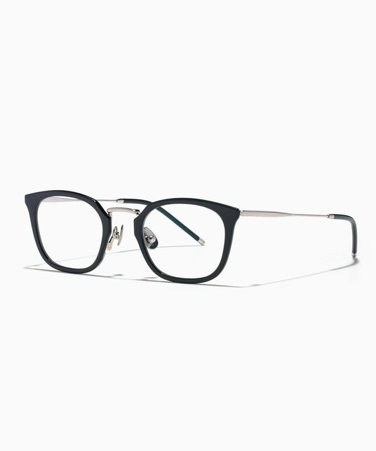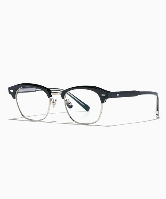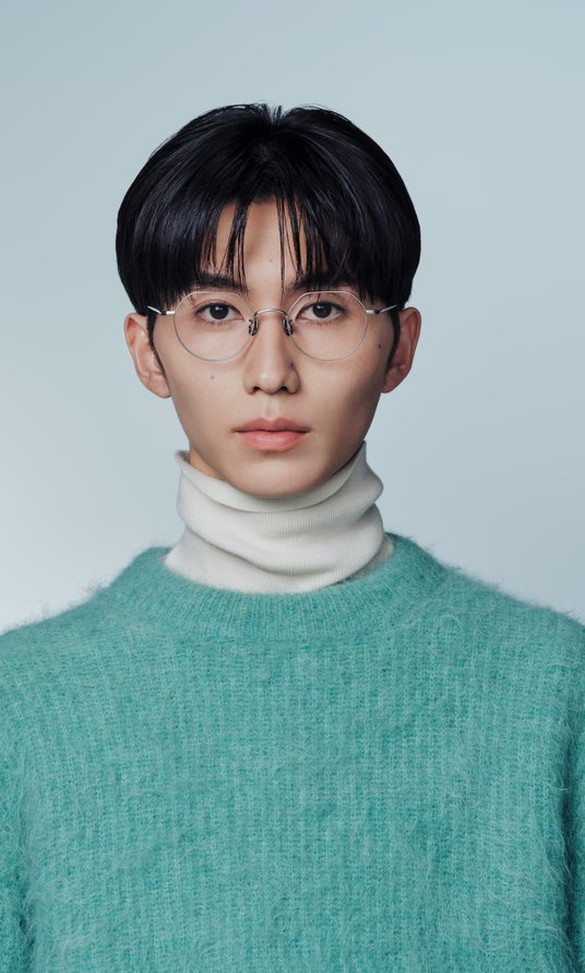 ボリューム感のあるヘアとのバランスを意識し、細身のメタルリムを採用。全体の丸みを活かしつつ、レンズはラウンドベース、ブローは直線的に仕上げ、ブリッジ中央に角を立てて目元を引き締めるデザインに。前髪に干渉せず、すっきりとした印象を演出。