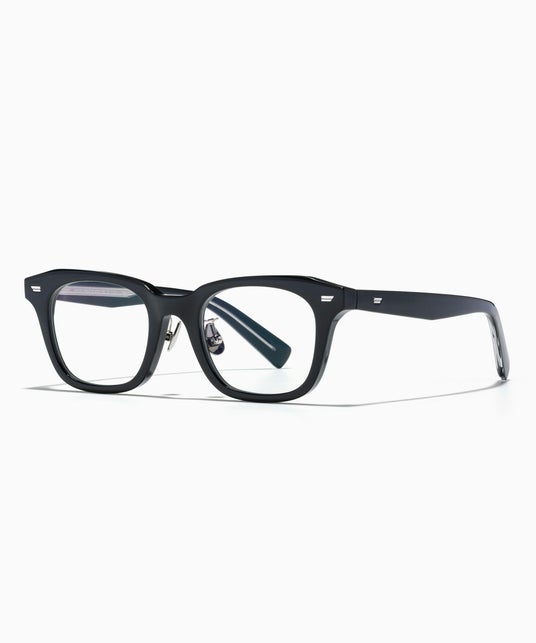 前髪をアップすることで露わになったフェイスラインを、ボリュームのある黒縁メガネが引き締め。眉頭と眉山に角を立てたリムラインが、目元をキリッと際立たせ、ボリュームのあるヨロイがこめかみ部分の余白を埋めることで、小顔効果をアップ。飾りパーツがアクセントとなり、フェイスラインを引き上げて見せる効果も。