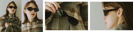 馴染みやすさがありつつも、 甘く転ばないウェリントン型。やや太めのサングラスが個性を引き出してくれる。