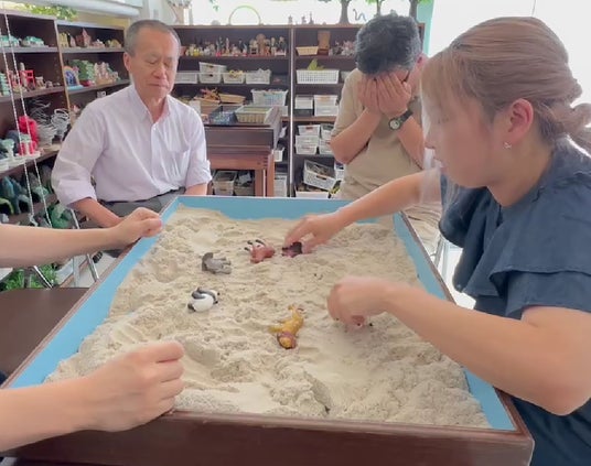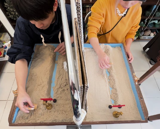 まねっこ砂箱の真ん中に仕切りをし(或いは、二つの砂箱を使って)、一人が創作しながら、その創作内容を言葉で表現します。その内容を聞いて、もう一人は創作内容を「まね」します。どこまでマネできるか?砂の形状からミニチュアの位置まで、難しさを味わいながら、コミュニケーションが深まります。