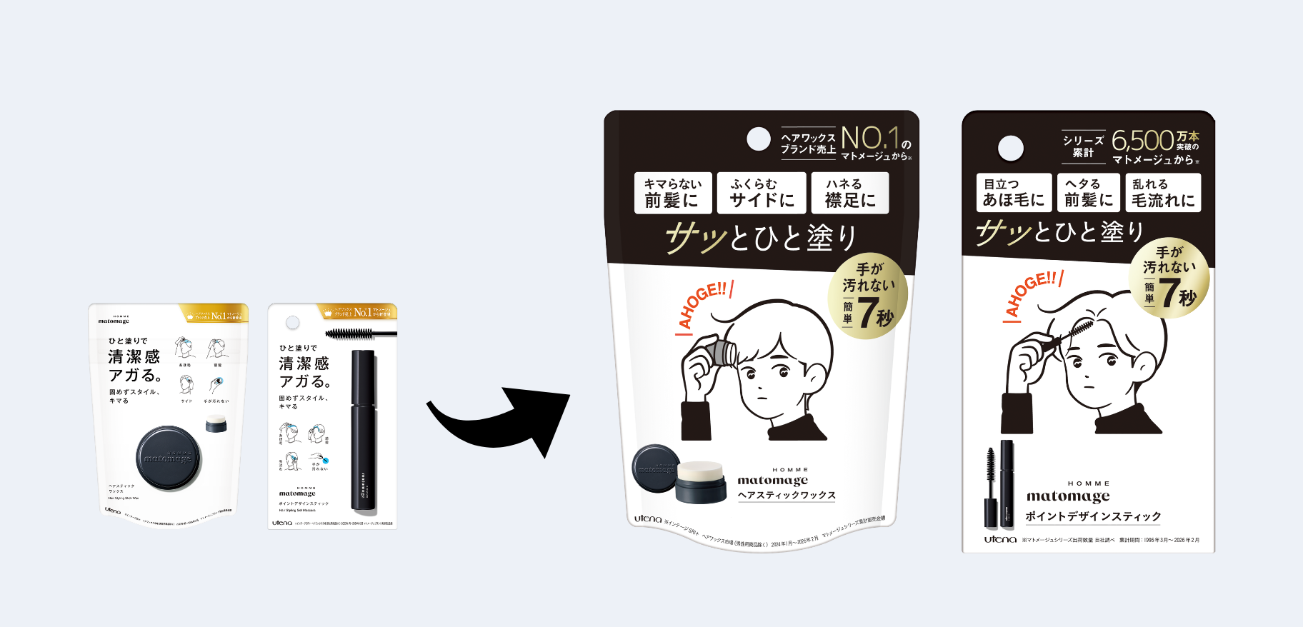 株式会社ウテナは、男性向けポイントスタイリングシリーズ「マトメージュオム」のパッケージデザインをリニューアルいたします。今回のリニューアルでは、一見すると使い方が想像しにくいスティック型ワックスとマスカラ型ジェルの形状・利便性がわかりやすいパッケージに刷新いたしました。手が汚れないメリットと「どのような悩みにどう使うのか」が直感的に伝わるデザインに進化しています。2026年3月2日より全国のドラッグストア・バラエティショップ等で順次切り替えいたします。