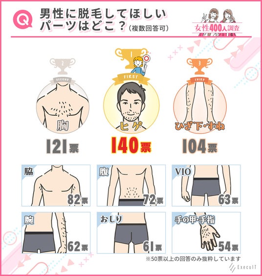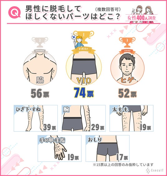 また、男性に脱毛してほしくないパーツについても質問したところ、400人中74人が選んだ「VIO」が最も多く、次いで「脇」「ヒゲ」が続く結果となりました。