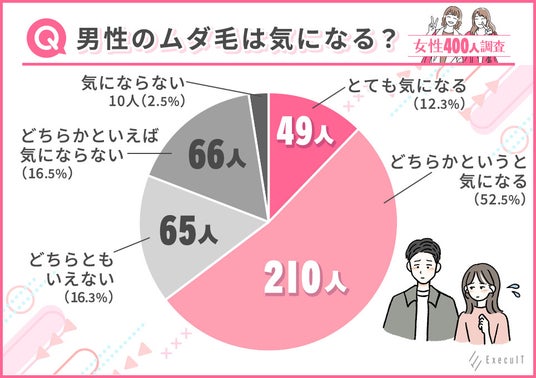 まずは、男性のムダ毛が気になるかどうかを調査してみると、400人中259人の女性が「とても気になる」「どちらかというと気になる」と回答しており、6割以上の女性が男性のムダ毛を気にしているということが判明しました。