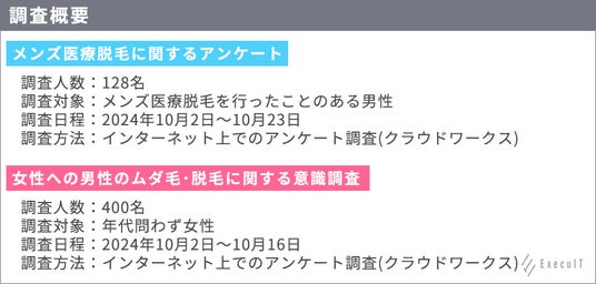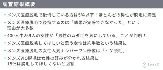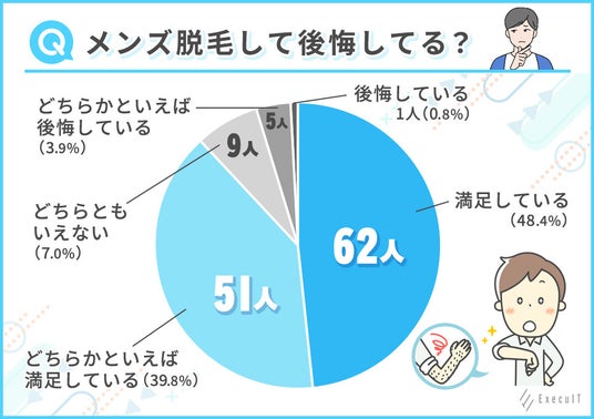 メンズ脱毛や女性の医療脱毛に関する総合情報メディアを運営している株式会社ExecuIT(https://execuit.wpx.jp)では、メンズ医療脱毛を行った経験のある男性128名を対象にアンケート調査を実施し、メンズ脱毛で後悔している男性がどの程度いるのか、後悔する理由はあるのかを分析しました。