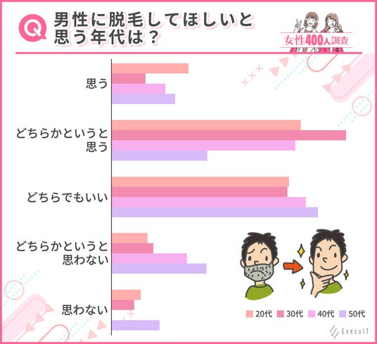 更に、男性に脱毛してほしいと思うかについての回答を20代・30代・40代・50代の年代別に分析してみると、20代・30代は「どちらかというと思う」、40代・50代は「どちらでもいい」と回答した方が多く、若い年代の女性の方がメンズ医療脱毛を推奨している人が多いということが分かりました。