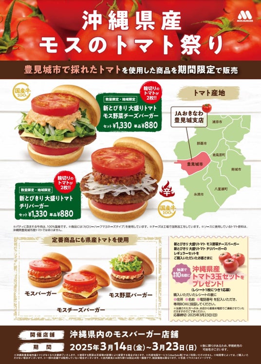 モスバーガーを展開する株式会社モスフードサービス(代表取締役社長:中村 栄輔、本社:東京都品川区)は、2025年3月14日(金)~3月23日(日)の10日間、沖縄県のモスバーガー22店舗で、トマトを使ったすべての商品に、沖縄県内のモスの契約農家である『JAおきなわ 豊見城支店』で収穫されたトマトを使用する『沖縄県産モスのトマト祭り』を開催します。また同時に、地域・期間限定商品も販売いたします。