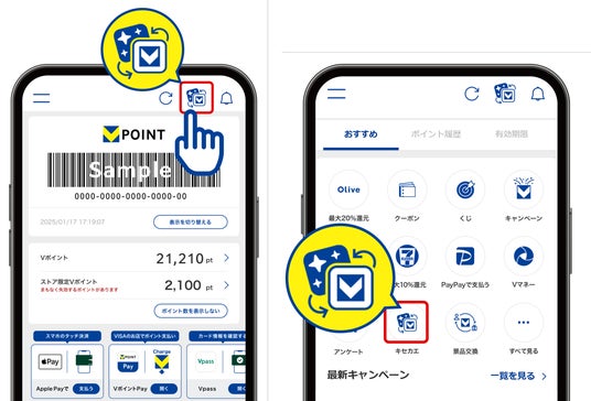 ■特典:Vポイントアプリでくじを期間中1日1回まわすことができ、全員にVポイント1ポイントまたは10万ポイントが当たります。