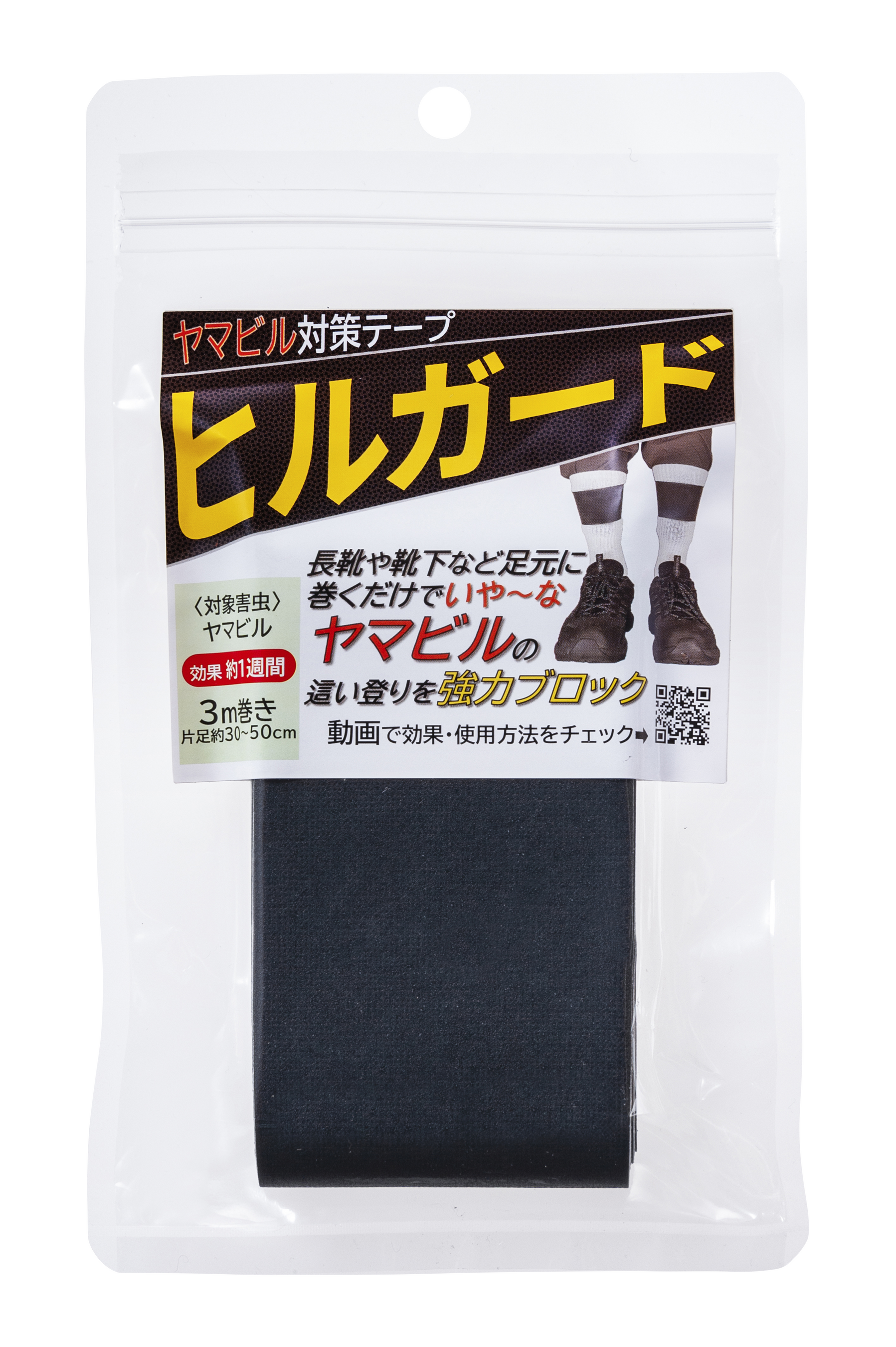 ヒルガードは長靴や靴下など足元に巻くだけで、簡単にヤマビルの這い上りをブロックできる、新しいタイプのヤマビル忌避テープです。